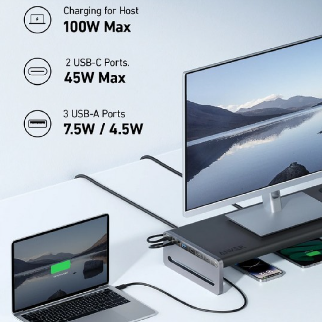 Anker 675 扩展坞是一个显示器支架,采用金属铝材质,用料和细节还不错。在侧面和底部有扩展接口,一共是十个,有大量USB-A、USB-C、读卡器等,其中位于底部的一个USB-C可输出100W。