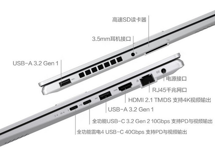扩展方面,包括雷电4、全功能USB-C、双USB-A 3.2 Gen 1、HDMI 2.1、读卡器、3.5mm耳麦插孔和千兆LAN。另外,支持WIFI6E无线,内置70WH大电池,支持100W PD供电,支持5V-20V宽幅电压,续航7.6小时左右,半小时可充至50%。