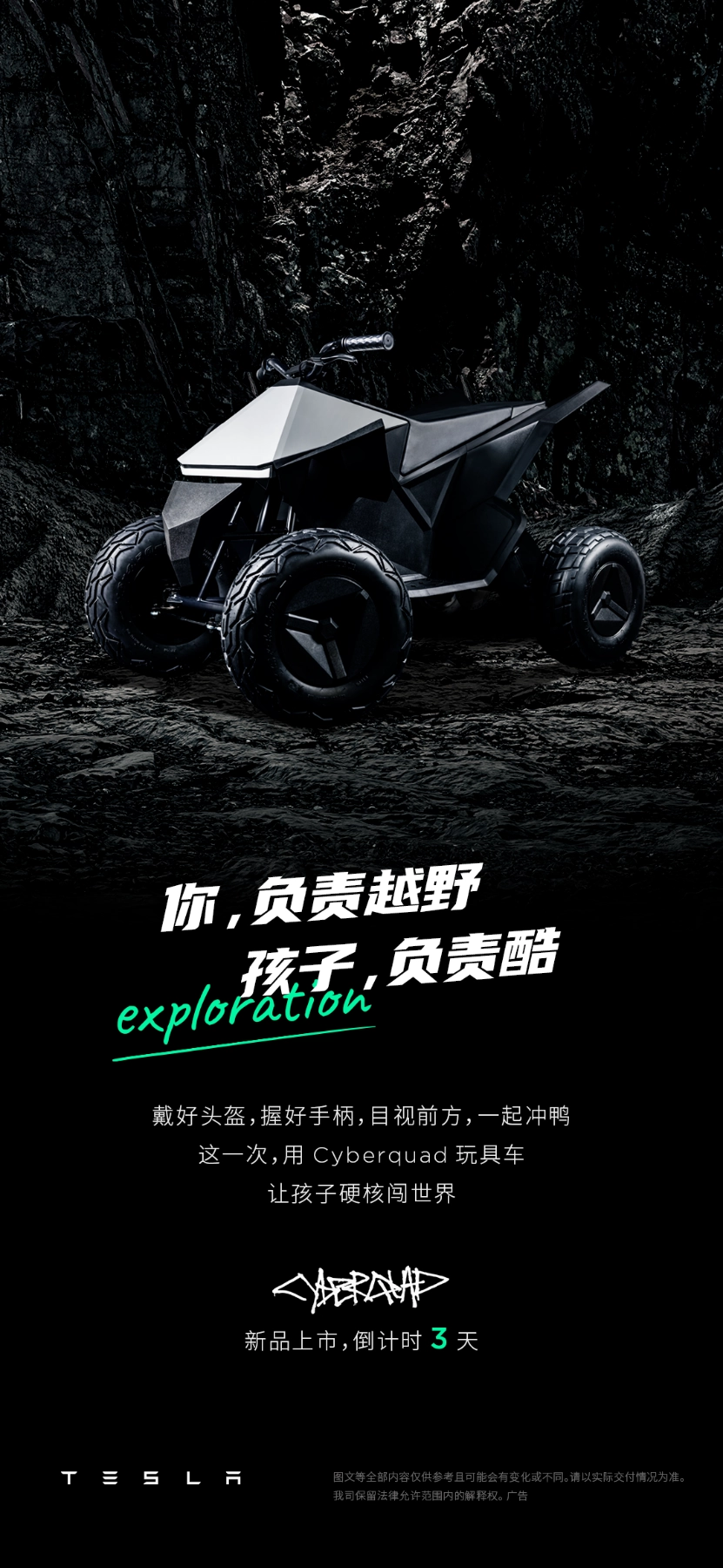 日前,特斯拉发布预告海报,称面向儿童的玩具电动车 Cyberquad 即将在国内开售。根据海报上的信息显示,新车将在 3 天之后正式上市。