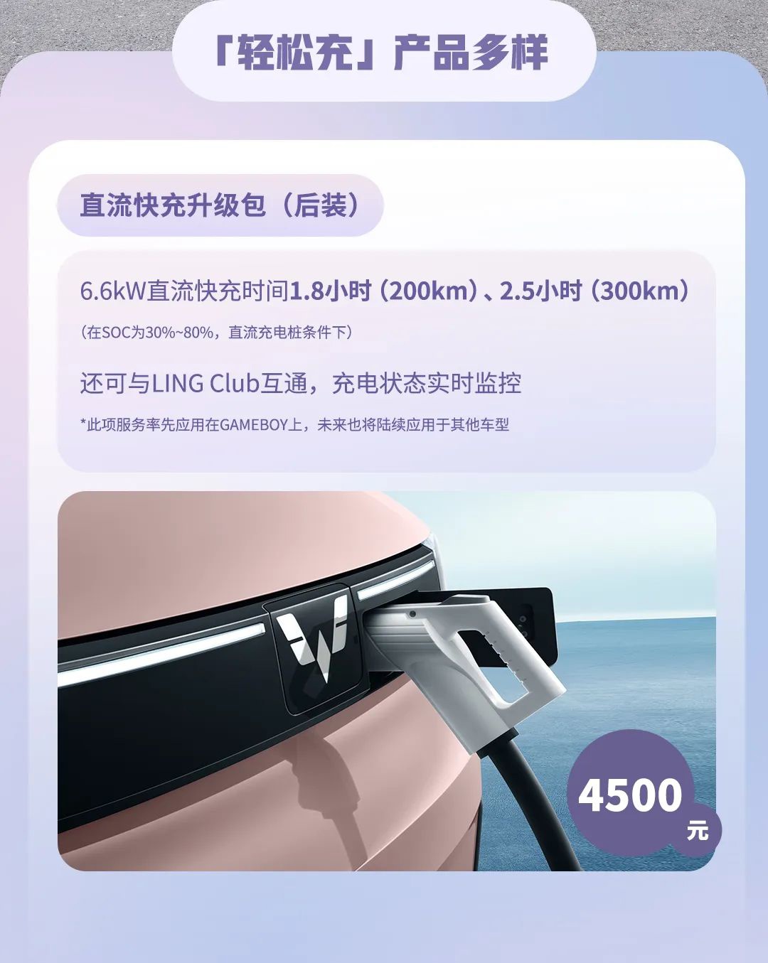今天五菱公布了“轻松充”服务的一些详细信息,包括直流快充升级包售价以及快充时间等。据官方介绍,直流快充升级包(后装)售价 4500 元,6.6KW 直流快充时间 1.8 小时 (200km)、2.5 小时 (300km),注:充电量为 SOC 30%~80%,直流充电桩条件下。还可与 LING Club 互通,充电状态实时监控。