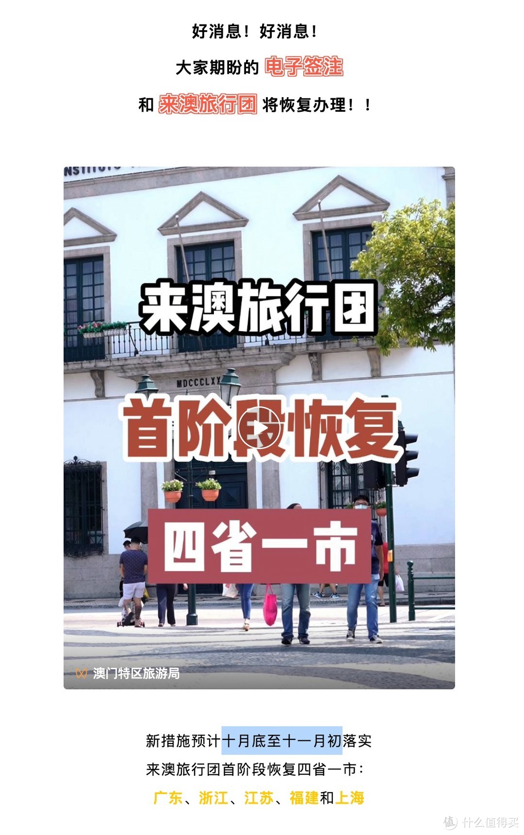 澳门特区旅游局消息,澳门将恢复与内地的电子签注办理,以及停办近3年的内地旅行团赴澳旅游也预计在今年十月底至十一月初恢复落实,包括广东、上海、浙江、江苏、福建在内的四省一市首先恢复。
